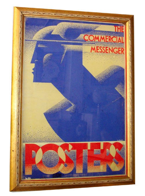 An original American art deco design for a poster promoting posters in gouache. The painting is done in blue and red on a yellow ground and is signed C.L. Barber. Mercury, the messenger of the gods, promotes the idea that posers are “The Commercial Messenger”. The gouache measures 29” x 19 ½” and is presented in a gold frame.