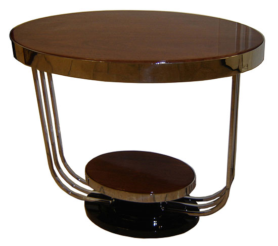 This American Art Deco table dates from the 1930’s. With a black lacquer base and two high gloss mahogany surfaces banded in bright nickel and connected by six curved nickel supports, the table will stand out in any room. The table measures 25” x 15-1/2” and is 22-1/2” high.
