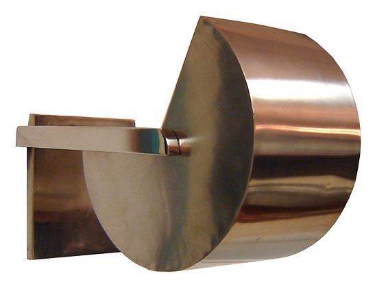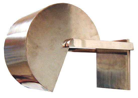 These art deco sconces are made entirely of polished steel. The cylindrical "Pacman" heads contain two sockets and rotate to cast light up or down through a 180 degree range. Newly rewired for American electricity, the sconces are 9 ½" high x 5 7/8" wide and extend 14 ¼" from the wall.