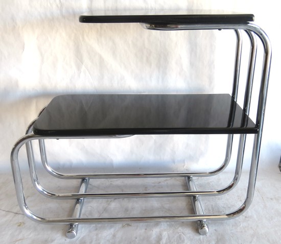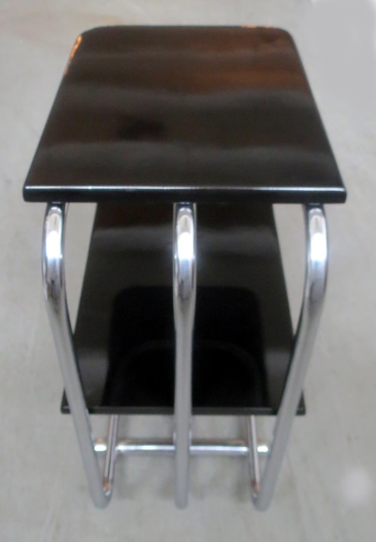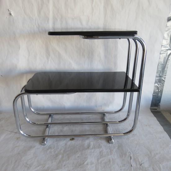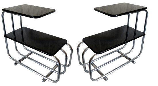 This pair of American Art Deco streamline black lacquer and chrome side tables were designed by Alfons BachAlfons Bach