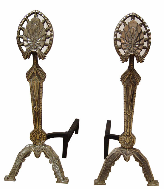 A pair of American art deco andirons from the 1930’s. The andirons are cast iron and marked “Universal Electricity Co., Chicago, USA”. They measure 22 34/” high x 9” wide and 20” deep.