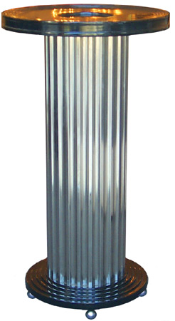 This pair of art deco columns are attributed to the Chicago Manufacturing Company ca. 1930's. Each with a grooved circular top with inset black glass, fluted steel columnar shaeft and circular stepped base on ball feet. Each measures 28" high x 18" diameter.