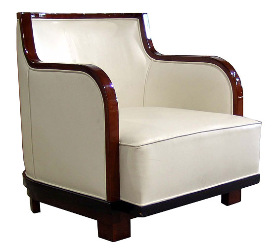 A comfortable yet stylish pair of French art deco arm chairs dating to the 1930’s. These chairs, in mahogany stained beech and soft cream leather invite you to “sit and rest a spell”. The chairs are refinished in a high gloss lacquer and measure 25 ¼” wide x 31” deep and are 28 ¼” high. The seat height is 13”.