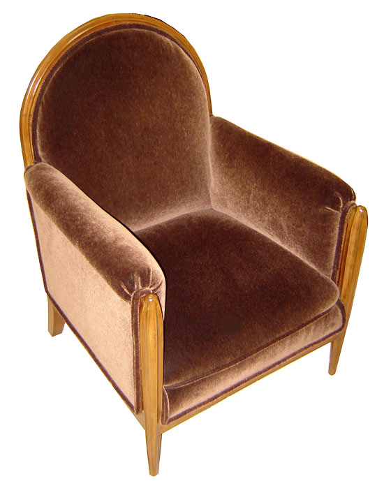This pair of French art deco club chairs date from the 1930’s. The carved front legs extend up to support the arms and the round back is surrounded by a matching wood crest. The chairs have been reupholstered in warm brown mohair. They measure 28 ½” wide x 28” deep x 34 ¾” high. The seats are 15 ½” high.
