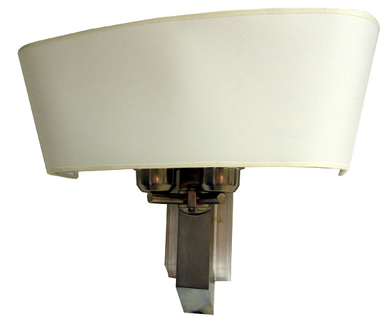 We were fortunate to find six of these French 1940’s art deco sconces. With brushed nickel body flanked by Lucite flanges. The sconces feature two light fixtures and wrap-around shades. Each sconce is 15” high; the shades are 16” wide and project 7” from the wall and are rewired for American electricity. You can purchase two, four or all six sconces.