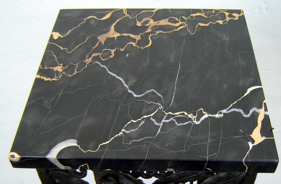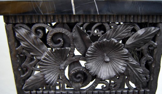 This pair of wonderfully crafted wrought iron pedestals are in the style of Paul Kiss (1885 – 1962). The pedestals, with an intricate apron of flowers, leaves and swirls sit on elongated corner supports with a flat base and three ball feet at each corner. The one inch thick tops are of costly Italian “Portoro” marble. Each pedestal measures 12 ½” square and 40 ½” high, ready for your home.