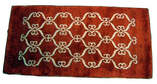 This pair of French art deco carpets was designed by Jules Leleu (1883 – 1961) in the 1940’s. The hand knotted wool rugs feature a series of arabesques in white displayed on a rust colored ground. The rugs measure 55 ½” x 28 ½” and are in excellent condition.