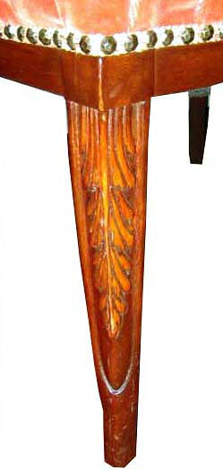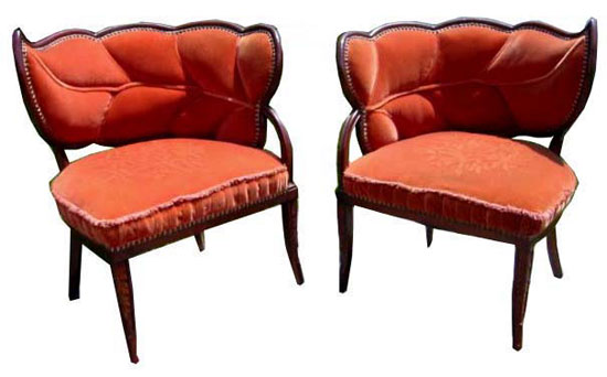 A pair of stylish French art deco “Leaf” chairs. In their original salmon mohair, the chair backs are in the shape of a leaf with a bouquet pattern embossed on the seat. The mahogany stained frame curves around the back and forms one arm for each chair. The front legs are carved in acanthus leaf design. The chairs each measure 27” wide x 24” deep x 37” high.