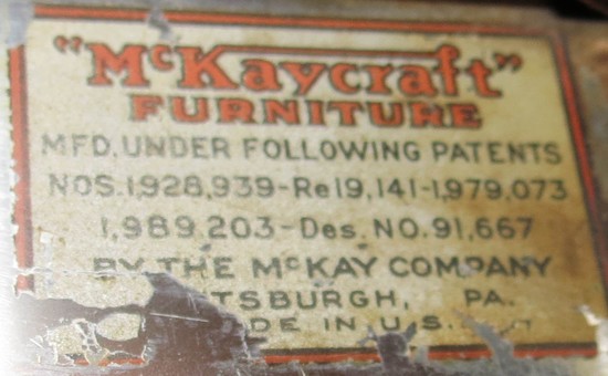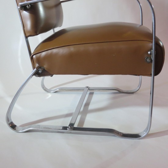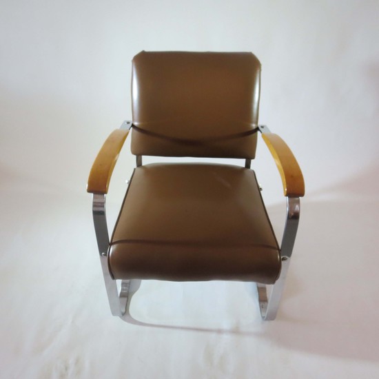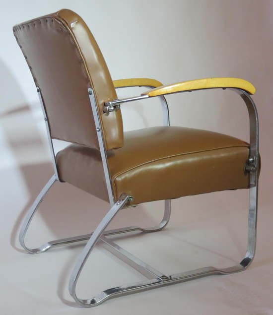 This pair of American art deco chairs was produced in the 1930s by McKaycraft Furniture for the McKay Company, Pittsburgh, PA. The chairs are machine age masculine with sturdy members of flat band steel with blond wood arms and their original light brown vinyl upholstery. The chairs are marked with a decal “McKaycraft Furniture…By the McKay Company, PA. Made in US”. Each chair is 33“ high, 27” deep, and 23 1/2” wide.