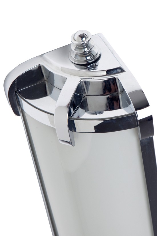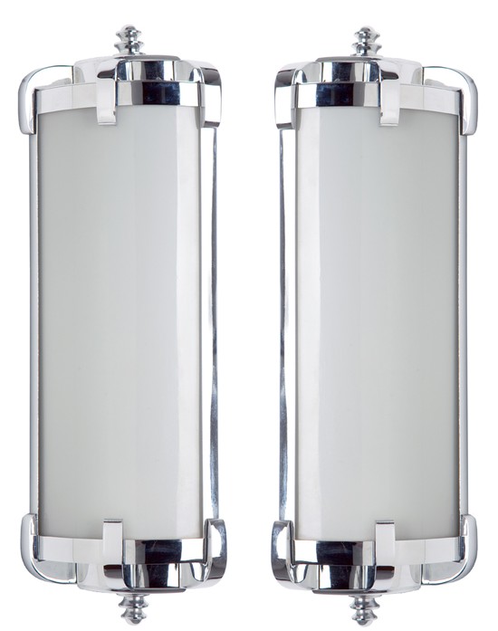 This pair of American art deco corner wall sconces are from the 1930’s. The sconces are made of nickel plated brass with a milk glass shade. They are heavy and well constructed with a stepped final on top and bottom. Each is 17” high. 6” across and 4” deep. They have been replated and rewired.
