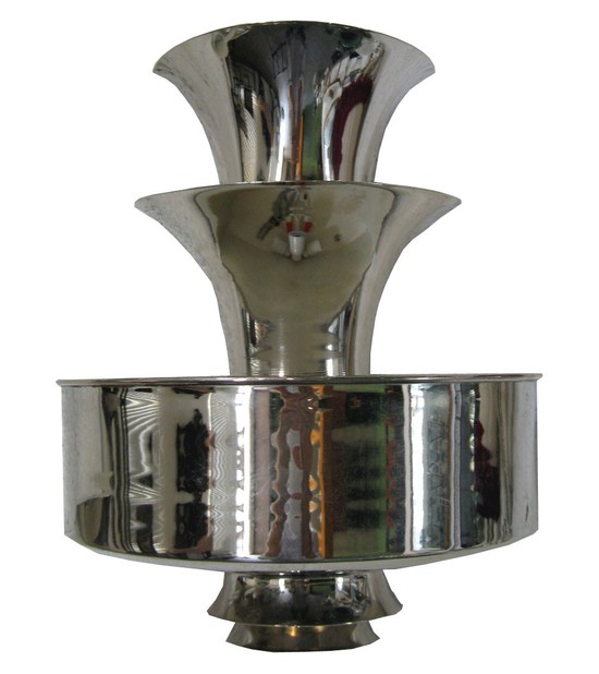 This pair of American art deco sconces are from the 1930’s. Constructed of nickel plated copper, the fixtures center on a demilune bowl which houses the lighting. Two shades fan out from the top carrying the light upward and reflecting light from their sides. Two smaller shades extend from the bottom. The fixtures have been replated and rewired and are ready to hang. Each measures 12 ½” high, 10 ½” wide and 6” deep.