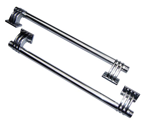 This wonderful pair of 1930's art deco theatre door handles is constructed entirely of aluminum. The handles have been polished to a bright shine and lacquered to prevent corrosion. Each handle is 25 1/2" long, 4" wide and projects 3" from the surface.