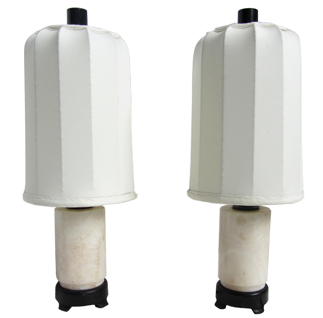 This pair of Austrian art deco table lamps are from the early 1930’s. The white marble shaft sits on an ebonized wood base which matches the wood finial. The hand made ribbed linen shades are typical of the country and period. The lamps are each 17” tall and 6” in diameter (at the bottom of the shade). They have been rewired for American electricity.
