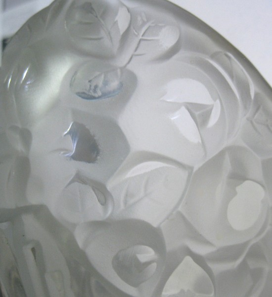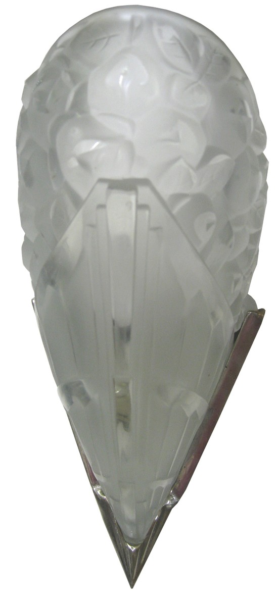 This pair of French art deco frosted glass and nickel bronze sconces date back to the 1930’s. The frosted glass is cast as a streamline basket with geometric flowers and foliage crowding from the top. The frosted glass is polished to clear to enhance the design. The nickel bronze fitting holds a 60 Watt bulb. The sconces each measure 5 ½” wide x 6” deep and 12” high.