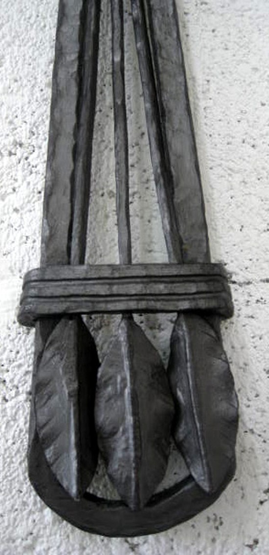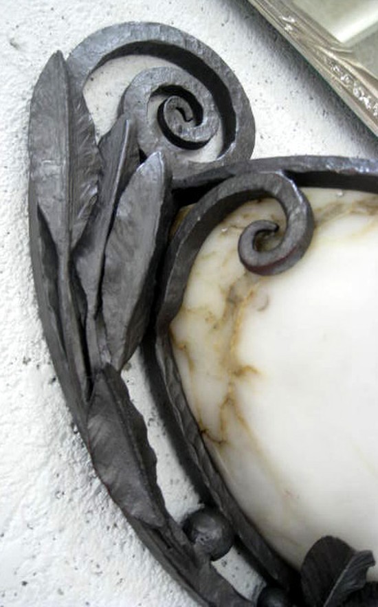 This pair of large hand wrought iron and alabaster wall sconces are quite interesting. Created in the style of Paul Kiss by a master craftsman, the attention to detail is superb. The bowl holds two bulbs giving a fine upward light with a warm glow through the alabaster. The sconces each measure 23 ½” high, 20” wide and project 6 ¾” from the wall.