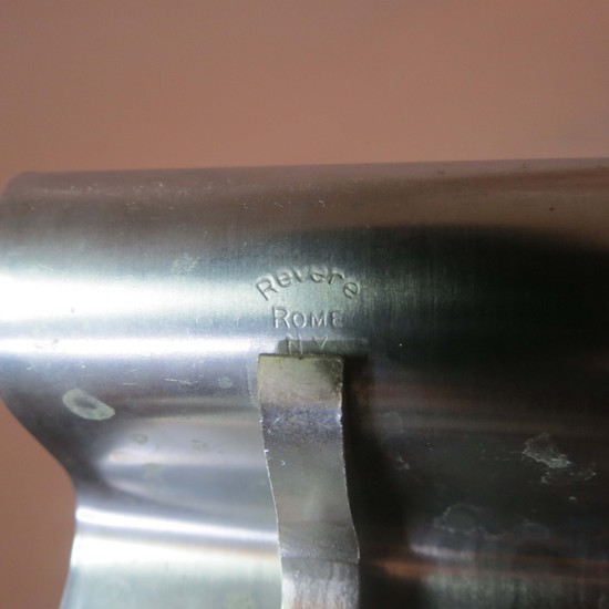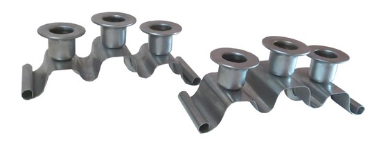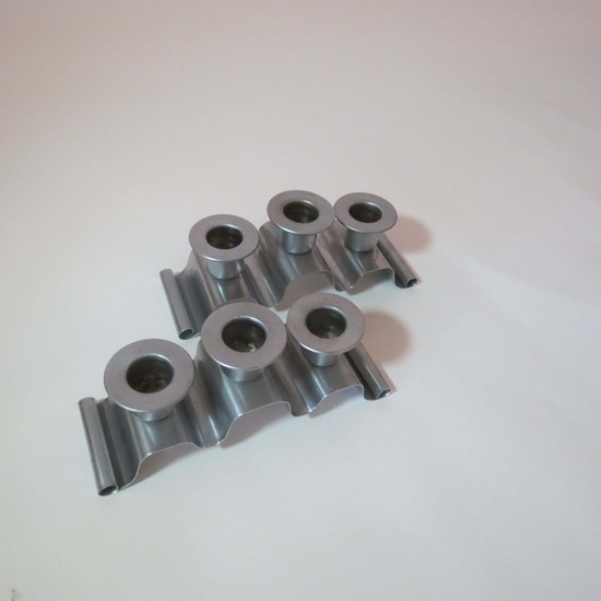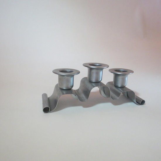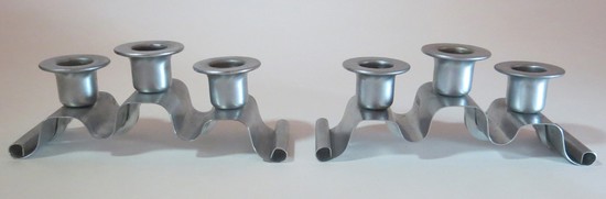 Norman Bel Geddes (1893-1958) designed this pair of satin chrome candle holders for the Revere Copper and Brass Inc. They were introduced in 1935 with their first gift catalog as the no. 135 tuxedo candlesticks. The catalog raphodises “A gentle grace and a flowing rhythm of design seldom caught in any but the finest handmade article”. Each holder accommodates 3 candles and is marked “Revere, Rome, NY”. They are 7 1/8” long, 2 ¼” wide and 2 ¾” high.