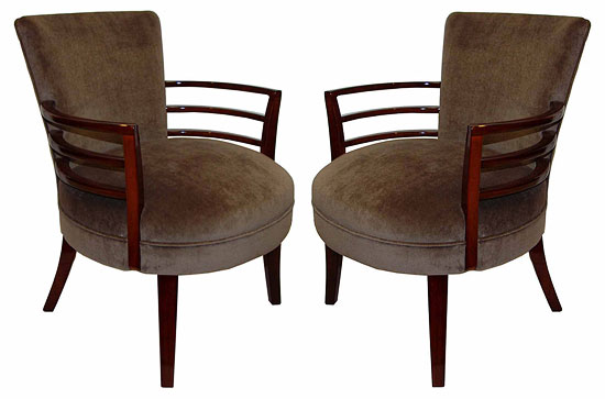 A pair of American art deco pull up arm chairs from the 1930’s. These chairs would be great in front of a desk or as an occasional chair in any room. They have three bands of curved wood for arms and shaped legs. The wood has been refinished and the backs and sprung seats recovered in a light brown cut velvet. The chairs measure 24 ½” wide by 23” deep and are 30” high at the back.