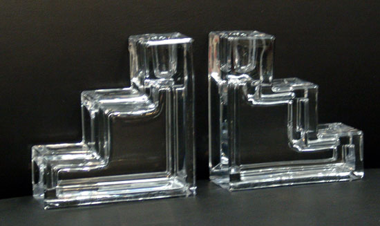 This pair of clear glass American art deco candlesticks was designed by Wilber L. Orme (1889 – 1972) for the Cambridge Glass Company in 1938. From his series “Pristine Table Architecture”, the candlesticks measure 5 ¼” x 5 ¼” x 2” deep.