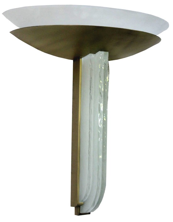 This pair of 1930’s French art deco wall sconces was originally designed in 1936 for the Palace of the League of Nations by Jean Perzel (1892 – 1986). The sconces have a bronze body, brass bowl, frosted glass collar and four individual long cast glass inserts. Fitted with two bulbs, the sconces cast a white light upward while the collar and cast glass pieces give your room a warm glow. The scones have been rewired for American Electricity, are impressed “Perzel” and measure 18” wide x 21” tall and project 9” from the wall.