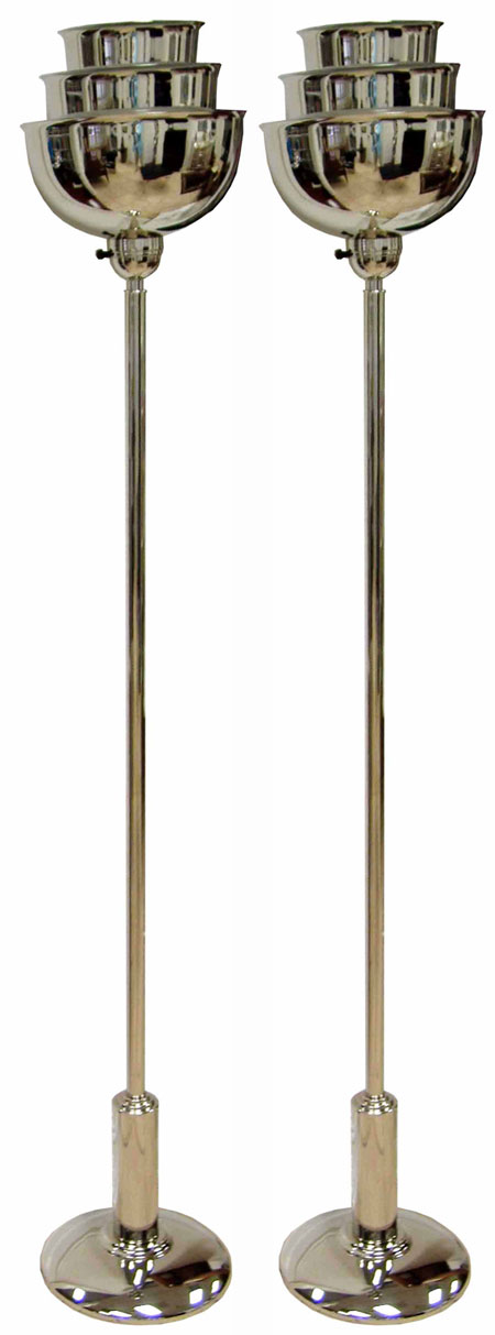 This pair of American art deco three bowl torchieres have been replated in bright nickel. Dating from the 1930’s the torchieres feature three bowls reducing in size from 11” in diameter to 6 ½” in diameter. The torchieres are 65 ½” in height and have been rewired.