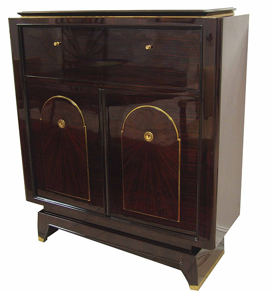 This spectacular art deco bar in the manner of Dominique, dates from the 1920’s and shows the work of a master ébeniste. The top, sides and legs are of Palissandre veneer with the grain in a vertical manner. The pull down service area is in Palissandre with a horizontal manner; the interior in Sycamore. The two doors are in a horizontal grained Palissandre with a central panel on each and the veneer in a rayed pattern radiating from the key escutcheon. The two doors open to reveal five drawers on the left and three shelves on the right. The fittings and sabots are of bronze. The bar measures 52” high x 45” wide x 16” deep.