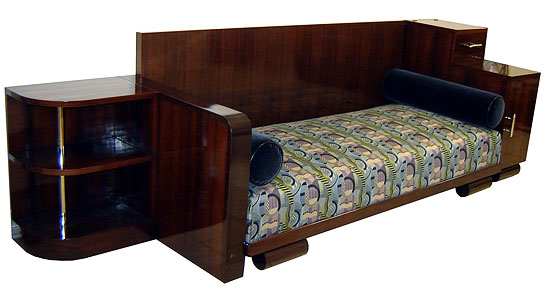 A French art deco daybed in Palissandre (Rosewood). One side has two shelves with a nickel rod support. The other side has a storage cabinet with door and a lift top to reveal a separate storage area. Both sport bright nickel handles. The bed area is well sprung and has been recovered in geometric fabric. A pair of black mohair bolsters completes the ensemble. The daybed measures 107“ long x 33 1/2” ” deep and is 34 ½” high.