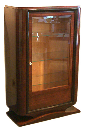 A fine French art deco vitrine in palissandre with a sycamore interior and 3 glass shelves. The glass door has a one inch bevel. The cabinet measures 57 1/2" high by 37" wide x 16 1/2" deep.
