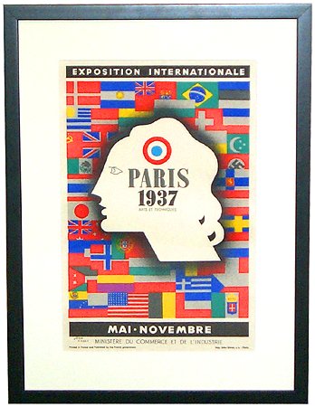 This poster for the Paris 1937 International Exposition was created by the French master, Jean Carlu (1900 – 1997). Carlu, who was in charge of the graphic arts pavilion at the 1937 Exposition designed this four color stone lithographic poster showing the head of Marianne, symbol of the French republic, superimposed on the flags of the participating countries. Printed by Jules Simon, Paris. The poster measures 50 1/2" x 35".