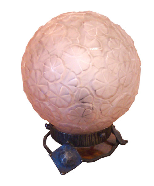 A French art deco table light with wrought iron base and a pale pink glass globe with an overall decoration of geometric morning glories. The lamp measures 8" high.