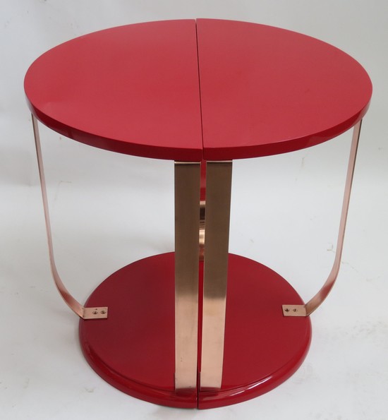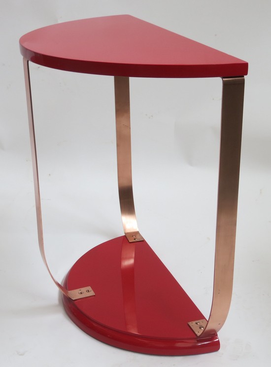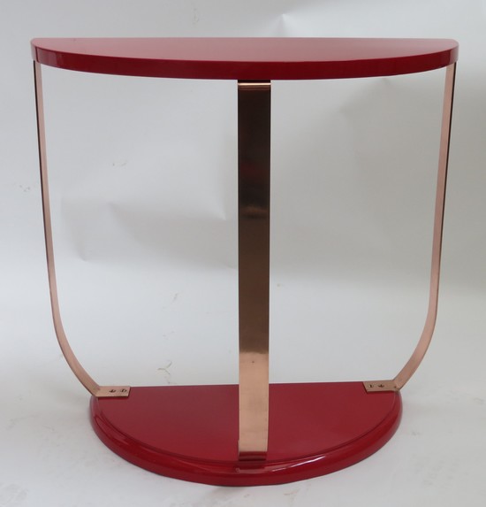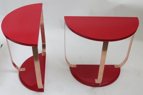 A striking combination of red lacquer and bright copper. This pair of American art deco demilune side tables were a product of The American Specialty Corporation of Indianapolis, Indiana in the 1930's; one of the tables is so marked. A new finish of red lacquer has been professionally applied and the copper polished, then clear lacquered so fingerprints and weather will not disturb the beauty of the tables. The tables are very well made… even the screws are made of solid copper. Each table is 23" high, 24" wide, and 12" deep.