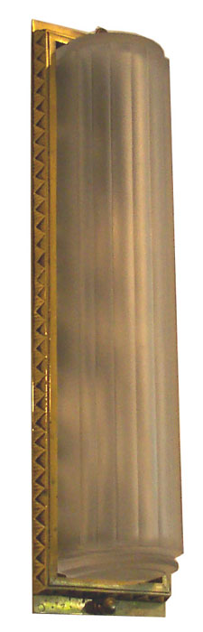 This 1930’s French art deco wall light was designed by Marius-Ernest Sabino (1878-1961) and features a bronze frame with a ribbed shade in frosted glass. The glass is signed “Sabino, France”. The light can be used horizontally or vertically and would be at home in a hallway, over a painting or mirror or in a bathroom. The fixture is 21” long x 5 ¼” wide and extends 3 ¼” from the wall.
