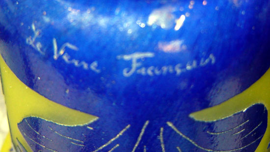 Art glass by Schneider was originally signed Schneider, Le Verre Francaise, or Charder (a contraction of Charles Schneider). Occasionally, it was signed with the inclusion of a small candy-cane of striped glass in the base.