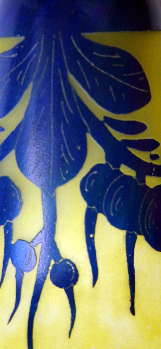 The glass that Schneider produced marked Le Verre Francais (the glass of France), and Charder, was made of two contrasting layers of colored glass. Part of the outer layer was cut away in various Art Deco motifs by acid etching, to reveal the...