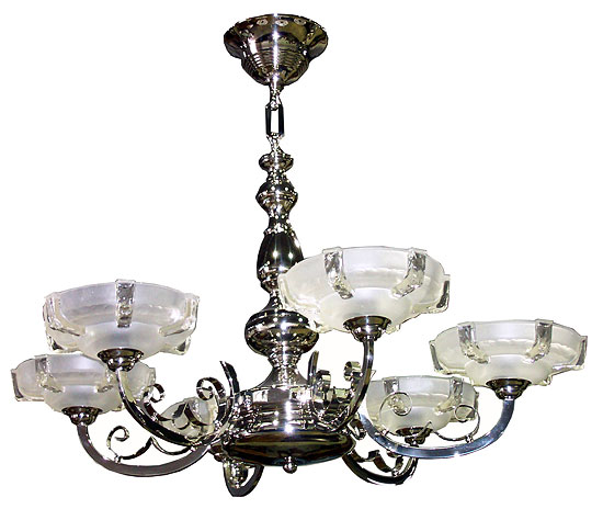 A magnificent French art deco chandelier from the 1930’s, this fixture features a nickel on brass body with intricate scroll work supporting six illuminated bowls. The bowls combine frosted glass with projecting strips of clear glass in a “chipped ice” design. The chandelier drops 25” from the ceiling and is 34” in diameter. It has been replated and rewired.