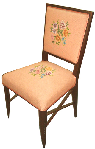 This set of four French 1930's art deco chairs consists of two arm and two side chairs, each with unusual criss-cross stretchers between the front and back legs. The high gloss mahogany frames feature pencil point front legs and tapering rear legs. All four chairs have their original period needlepoint upholstery in excellent condition on the seats and backs. The armchairs each measure 35" high x 20" wide x 20" deep, the side chairs measure 35" high x 18" wide x 20" deep.