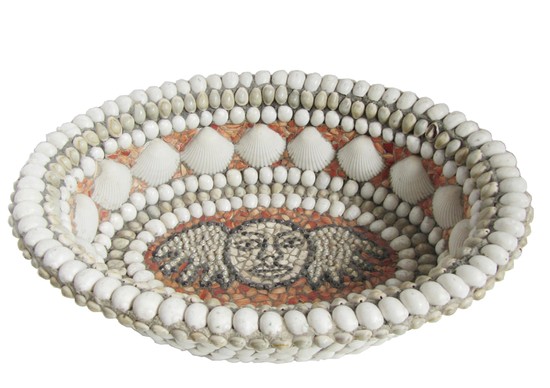 This bowl is by contemporary artist Barton Lidice Benes (1942 -). Typical of Benes late 1970’s work, the bowl is composed of hundreds of sea shells in a matrix of his own making. Known as a master of “found” elements in his work, the shells are arranged in a pleasing pattern. The “wings” on the face of the central image are tiny iridescent shells. The iconography comes from tombstones and momento mori images of colonial times. The bowl, which is 5” high, 8 ½” long and 14 ¾” wide is in great condition with the exception of two partially broken shells.