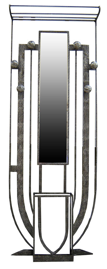 This French art deco hand wrought iron hall tree dates from the 1930’s and is in a classical shield form. The hall tree has a central mirror, a shelf for hats, six hooks for coats and a container for umbrellas. The tree measures 29 ½” wide x 77” high and is 6” deep.