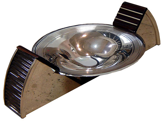 A very special French art deco centerpiece. The body and bowl are of silver plate, the two wood portions are macassar ebony inlaid with elephant ivory and the ends are cascading glass rods. The base is on a wood pedestal. A very exciting centerpiece for your dining table, console or entrance table. The centerpiece measures 19 ½” wide x 5 ½” high. The bowl is 12” in diameter. The silver has been replated, the wood refinished, the ivory cleaned and the glass rods washed.