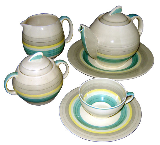This 29 piece English Art Deco tea set was designed by Susie Cooper (1902-1995) and produced by Wood & Sons Crown Works, Burslem, England in 1932. The set consists of a tea pot and sugar in the “Kestrel” line, a large creamer, two 9-1/2” cake plates, twelve tea cups and twelve 7” cake plates. The service is in a banded pattern on a cream ground. The bands are of two shades of green, yellow and two shades of green. All pieces are marked “A Susie Cooper Production. Crown Works. Burselm, England”. All except the tea cups alos carry the leaping deer mark.