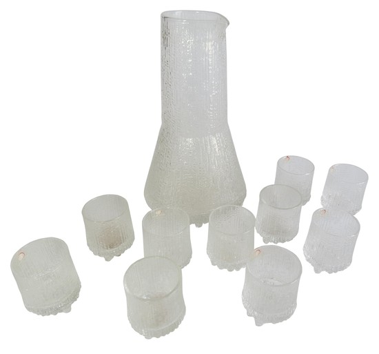 After dinner drinks set of carafe and ten cordials designed in 1968 by finish master tapio wirkkala (1915-1985) for Iitalia and are from his Ultimo Thule line. Inspired by melting ice, the hot glass is blown into wooden molds which give the glass a unique pattern as the glass burns the wood. The carafe is 8 ½” tall and the cordial glasses are each 2 ¼” tall.