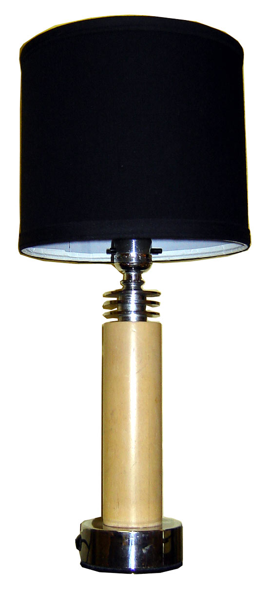 This American art deco table lamp by Mutual Sunset Lamp Company features a black base and shade. The blond wood shaft is topped by three chrome disks. The lamp has been rewired and is 18" high.