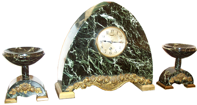 This three piece French art deco clock set features a black with white inclusions marble clock with a bronze band of stylized roses across its base. The clock measures 13 ½ high and 15 ¼ high and 15 ¼ wide. The side pieces are of the same marble with matching bronze roses, they stand 7" high and are 5 ¾ wide.