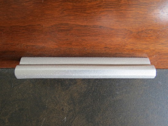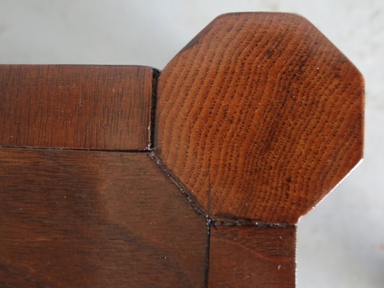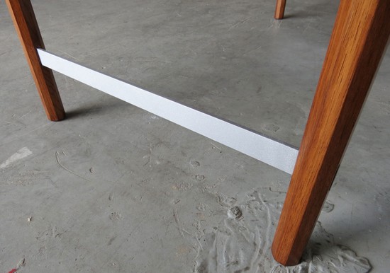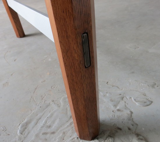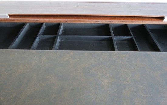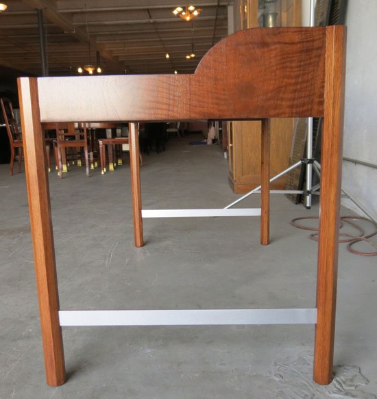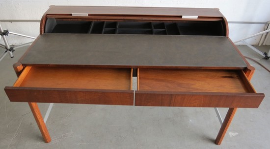 A unique vintage mid century modern roll top desk by the Hekman Furniture Company of Grand Rapids, Michigan. Hekman Furniture was funded in 1922 and become part of the Howard Miller Company in 1983. The company is still in business but this desk from 1960's is not in their line. The desk, with two drawers, has a body of figured walnut with stained oak hex-shaped legs. Inside the drawers the secondary wood is oak. The desk has a cylinder roll which opens to reveal storage compartments. The pulls on the cylinder and the leg stretchers are aluminum. The writing surface is of a tough composition made to resemble leather, it is 14 1/2” by 51 1/2”. Over all the desk is 54” wide, 28 ½” deep and 34” high at the back, the writing surface is 28 ¼” high. The desk is in excellent restored condition.
