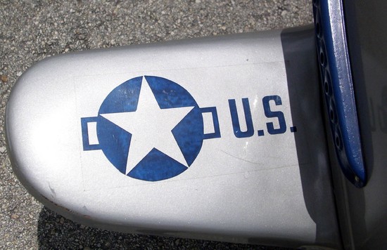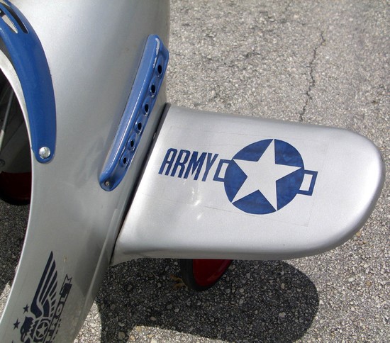 This American art deco streamline airplane pedal car dates to the early 1940’s when the advent of World War II caused a surge of patriotic feelings. Our Airforce was the “Army Air Force” and the wings are emblazoned “U.S. Army”. The fuselage is marked “Patrol” with fierce eagle and stars. The propeller, streering wheel and wheels are red, the three “guns”, cockpit faring and exhaust manifold are blue. The plane measures 44 ½” long, the wingspan is 36” and the top of the steering wheel is 25” from the ground. The plane is in excellent condition.