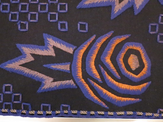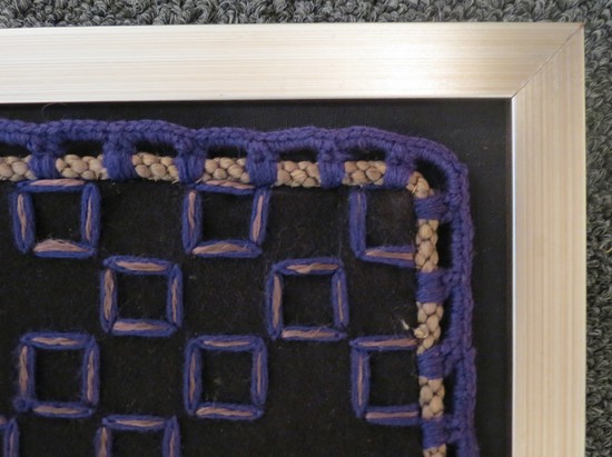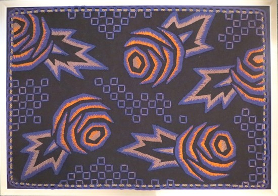 This vintage American art deco tapestry/wall hanging is from the 1930’s. On a black background, the artist created a vibrant image of comets among square stars (or maybe just deco roses?). Using silver, blue, and orange thread in crewel and cable stitching, the unknown artist has created an arresting work of art that will grace any deco interior. The fabric is 28" wide and 20" tall. It is presented in a silver frame and is 21 ½" x 30 ¼" overall.