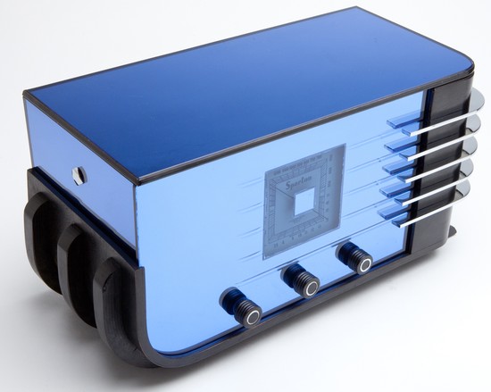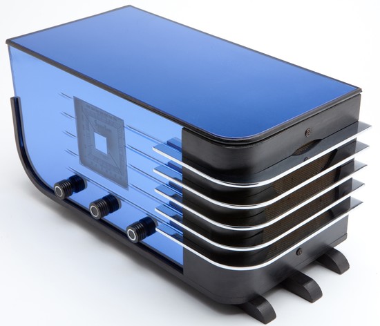 This American art deco radio was designed by Walter Dorwin Teague (1883 – 1960) for the Sparks-Worthington Company, Jackson, Michigan and introduced in 1936. It was produced until 1940. The radio, known as the “sled” is a marvel of art deco streamline style. Three ebonized wood bands on the left and five chromed bands on the right encase a body of cobalt blue mirror. The radio is 8 ¾” x 17 ½” x 8 3/8” and is in excellent condition.