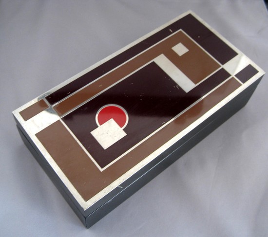 Walter Dorwin Teague (1883 -1960) designed this American art deco camera and box in 1930 for the Eastman-Kodak Company, Rochester, New York. Known as the Kodak Gift 1A Camera and Case, the camera and case both are in excellent original condition. A true icon of the Machine Age, they convey the utility and playfulness which embody the period. Teague’s enamel design on the metal top of the case, repeated on the front of the camera, captures the American spirit of the time. The case is 3 ½” high, 8” long and 6 ½” wide, the camera is 2 3/8” high, 8 7/8” long and 4 3/8” wide.