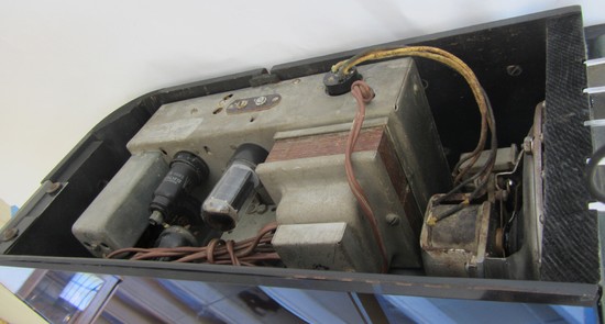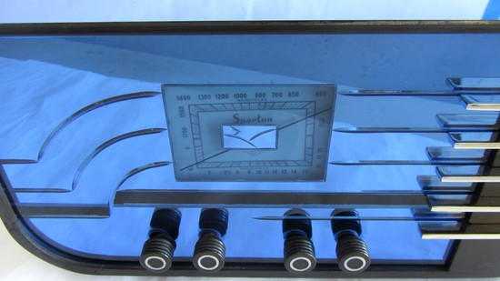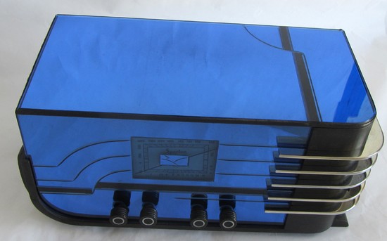 This American art deco radio was designed by Walter Dorwin Teague (1883 - 1960) for the Sparks – Worthington Company, Jackson, Michigan. Known as the 558, it was released in 1937. Collectors know it today as “the four knob sled” . The radio is constructed of etched blue mirror, ebonized wood, chrome fins and, of course the radio bits inside. The radio is 17 ½” wide 8 ½” deep and 8 ¾” high.
