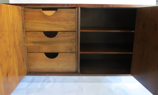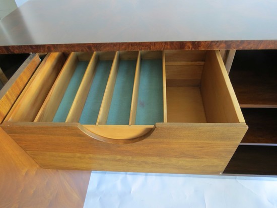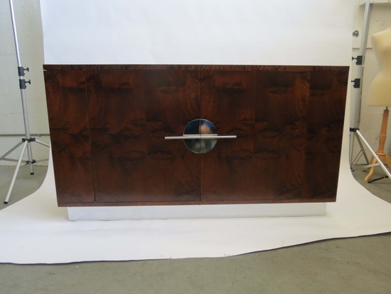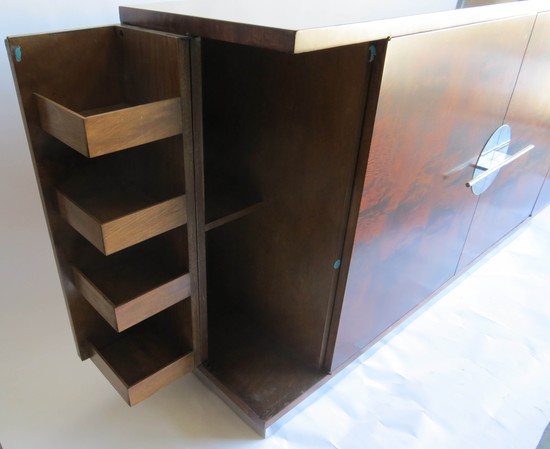 Walter Dorwin Teague (1883-1960) designed this sideboard circa 1935. It was manufactured by the Hastings Table Company of Grand Rapids, Michigan. The side board has book matched Paldao burl exterior and rests on an indented chrome steel base. The central handles match the base. The two doors open to reveal two shelves on the right and four drawers on the left, the top drawer has a sliding felt lined box to hold silverware. The left hand corner is hinged to rotate out and show four shelves for glassware and two areas for bottles. The sideboard is 68" wide, 18" deep, and 38" high.