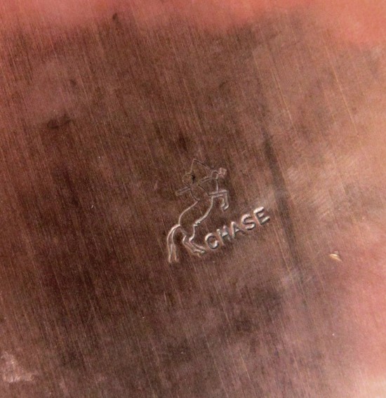 This four piece American art deco Diplomat coffee set designed by Walter Von Nessen (1889 – 1943) for the Chase Brass and Copper company in 1933 is rarely seen in copper. The story goes that Von Nessen, on being retained by Chase, wandered through their warehouse and discovered a stock of unused fluted tubing in their inventory and modified it to make the Diplomat coffee set. In 1933 it was one of his first designs for Chase. The copper set “earned for Von Nessen an Award of Merit from the National Alliance of Art and Industry”. This # 17029 Diplomat Coffee Set and # 17030 Round Tray are in great original condition with a soft glowing patina. The back Catalin handles and knobs match the tray inset. The coffee pot is 8” high, the sugar bowl is 4” high and the creamer is 2 ¾” high. The tray is 10 ½” in diameter. The coffee pot and creamer are marked with the Chase Centaur symbol.